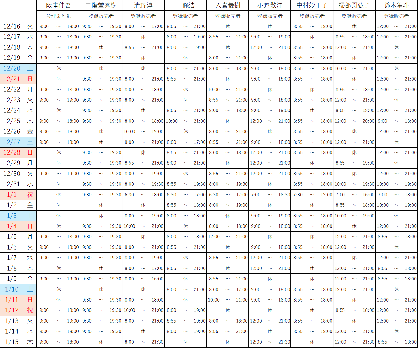 店舗の営業時間:9:00~21:00(年中無休) 特定販売の営業時間:10:00~17:00(土・日を除く) ※相談対応は特定販売の営業時間内のみ行っております。 |
