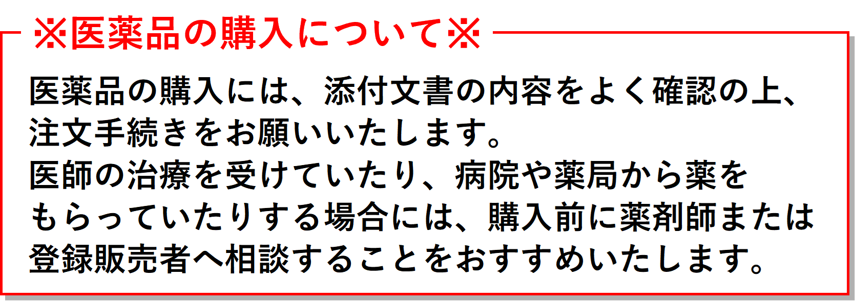 医薬品は、用法用量を逸脱すると重大な健康被害につながります。必ず使用する際に商品の説明書をよく読み、用法用量を守ってご使用ください。用法用量を守って正しく使用しても、副作用が出ることがあります。異常を感じたら直ちに使用を中止し、医師又は薬剤師に相談してください。